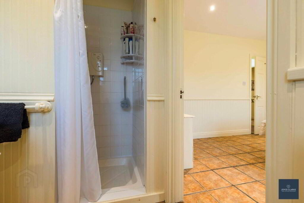 ENSUITE Pedestal style sink. WC. Walk in shower with Triton electric shower. Double panel radiator. Tiled floor. Wall panelling. Window. Recessed lighting. EXtractor.