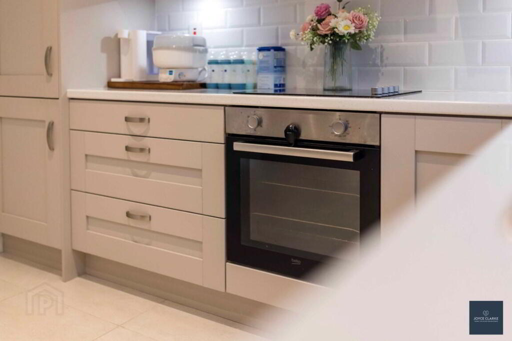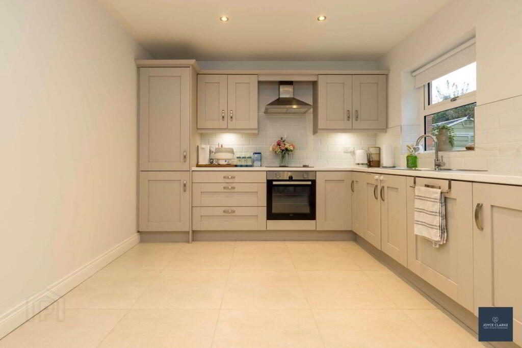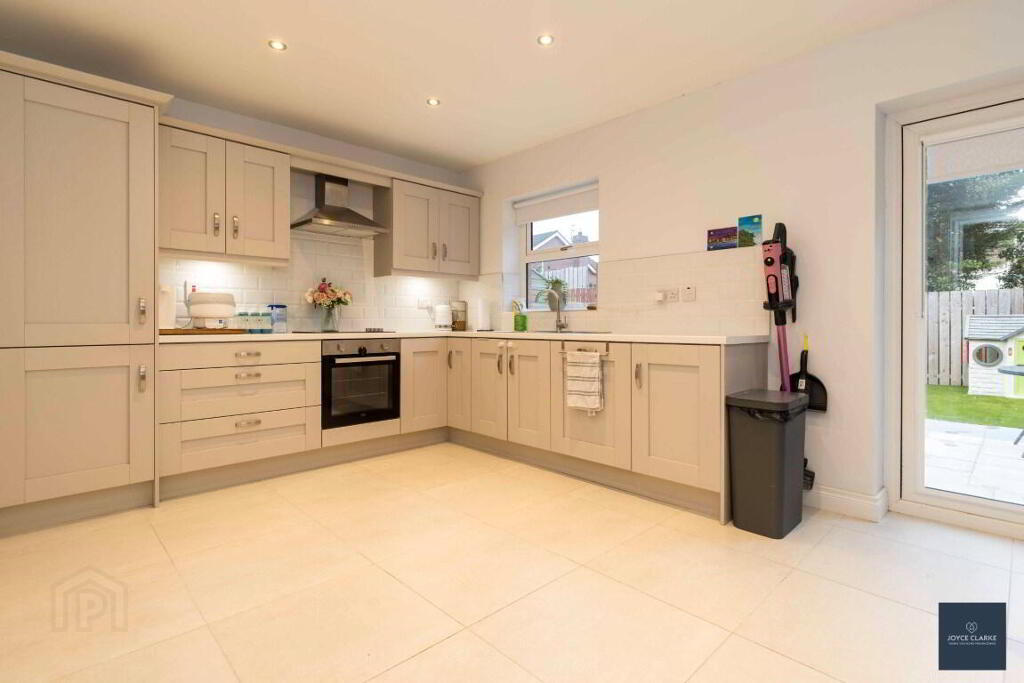 Open plan kitchen dining with a great range of storage units and integrated appliances