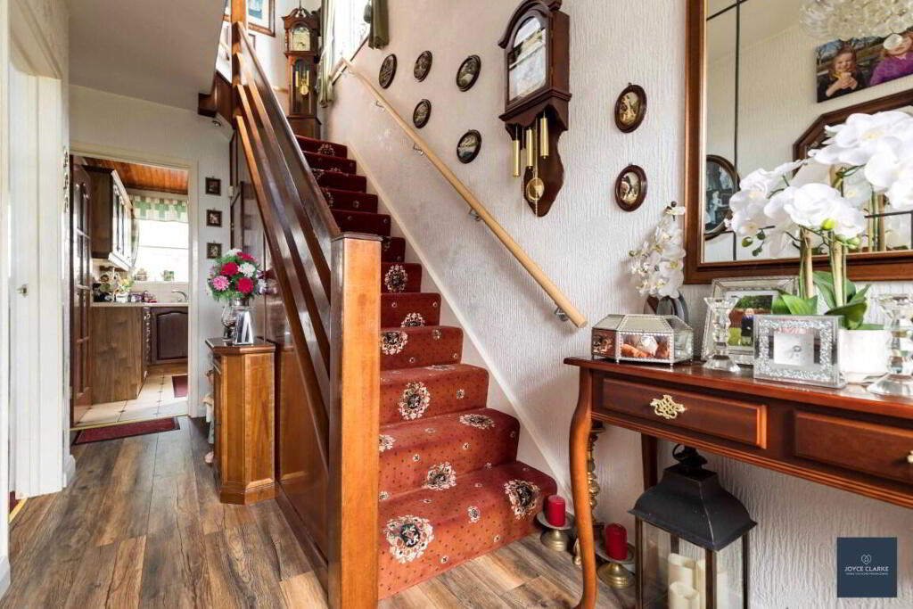 ENTRANCE HALL Hardwood door with ornate glazed panels. Side glazed panels. Laminate flooring. Double panel radiator. Under stair storage. Thermostat.