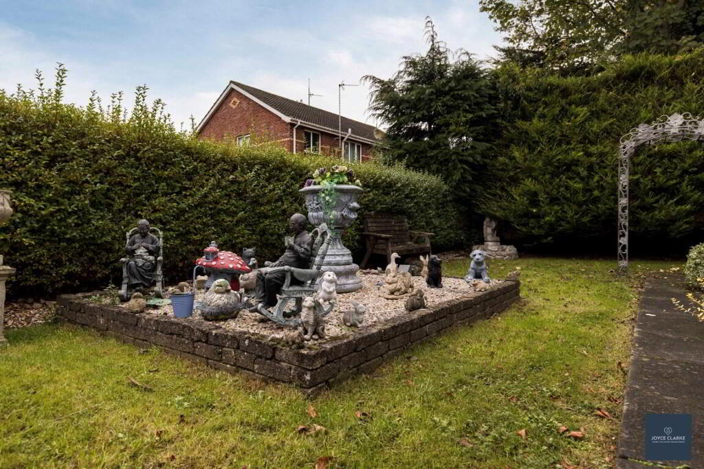 FRONT GARDEN Garden laid in lawn with ornate stoned feature bed. Tarmac driveway to side with double gates.