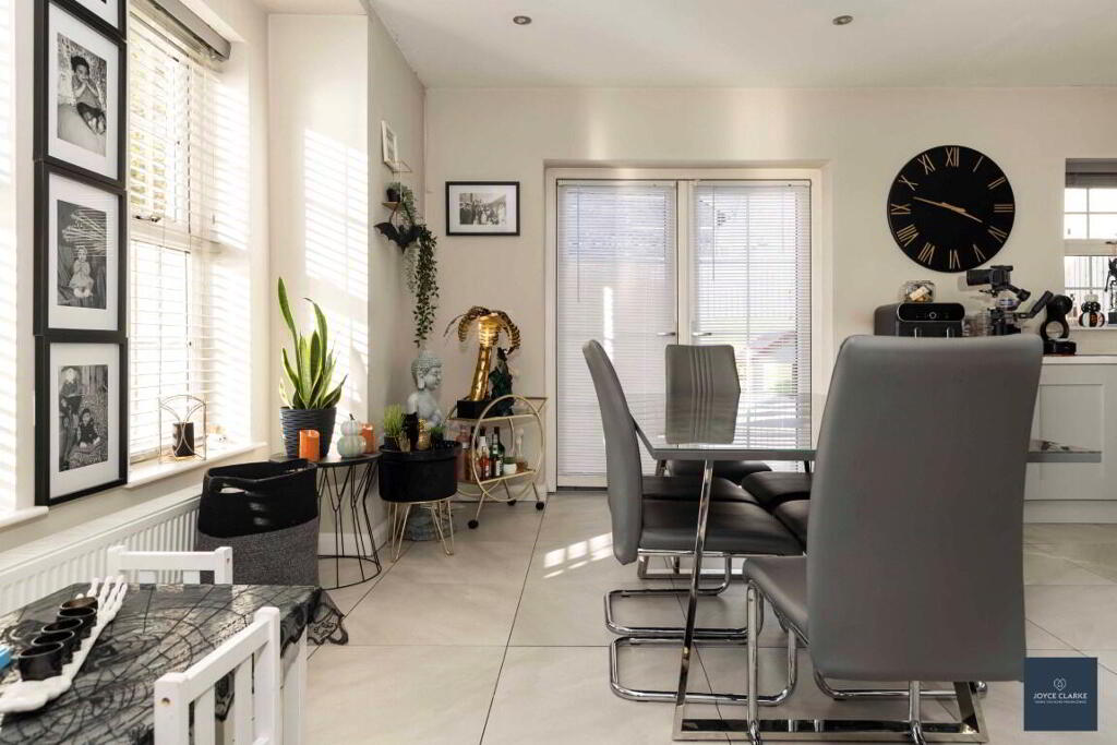 KITCHEN DINING 6.06m x 3.28m (19' 11" x 10' 9") Bright and spacious triple aspect kitchen diner open to living room with feature bay window to side. Excellent range of kitchen cabinets. Appliances include electric oven and four ring electric hob with stainless steel extractor canopy above, integrated fridge freezer and dishwasher. Stainless steel sink and drainage unit. Tiled flooring. Double UPVC framed patio doors leading to rear garden. Low-level double panel radiators