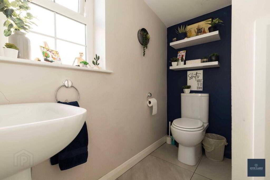 GROUND FLOOR WC 1.78m x 2.20m (5' 10" x 7' 3") (MAX) Dual flush WC and wash hand basin with pedestal. Tiled flooring and splashback. Single panel radiator. Storage closet. Window providing natural light.