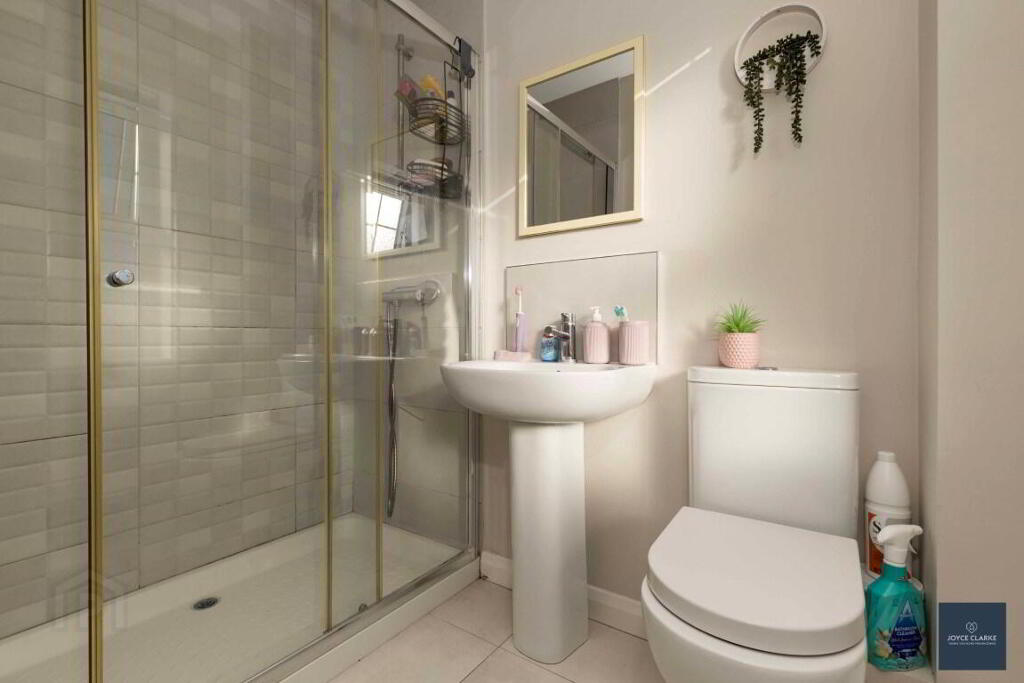 ENSUITE 1.41m x 2.28m (4' 8" x 7' 6") Tiled shower enclosure with mains fed shower. Dual flush WC and wash hand basin with pedestal. Single panel radiator. Tiled flooring and splashback. Extractor fan. Recessed lighting. Window providing natural light.