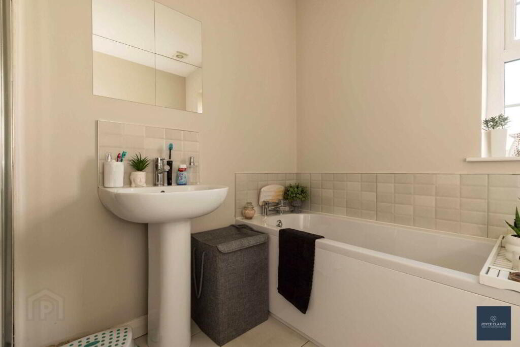 FAMILY BATHROOM 2.34m x 2.73m (7' 8" x 8' 11") Four piece bathroom suite comprising of panel bath, dual flush WC, wash hand basin with pedestal and separate tiled shower enclosure with mains fed shower. Tiled flooring and splashback to wash hand basin and bath areas. Double panel radiator. Recessed lighting. Extractor fan.