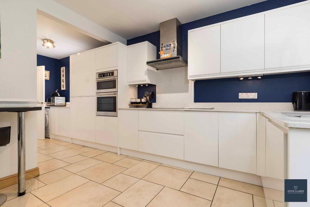 KITCHEN DINING 3.06m x 5.91m (10' 0" x 19' 5") (MAX) Modern white gloss kitchen excellent range of kitchen cabinets large saucepan drawers and put out larder, wired for under unit lighting. Range of appliances include four ring electric hob with stainless steel extractor canopy above, double eye level oven, integrated fridge freezer and washing machine. Quartz worktops, upstands and splashback to hob. Underfitted stainless steel one and half bowl sink. Space for tumble dryer. Double panel radiator. TV point for wall mounted TV. Tiled flooring. Storage closet with hot water tank