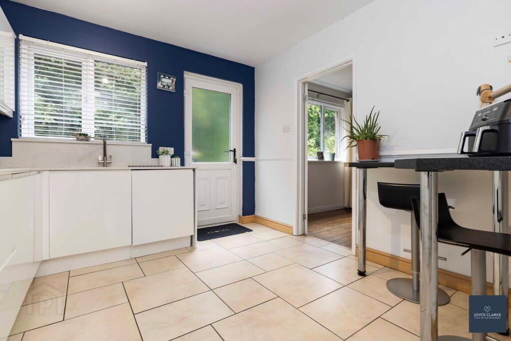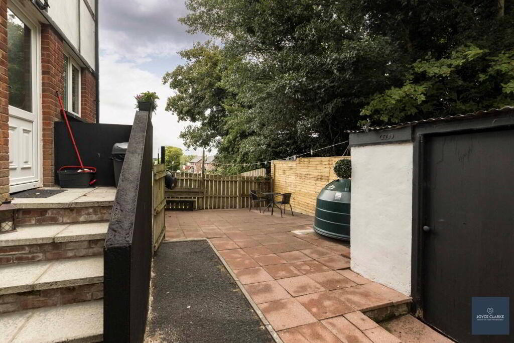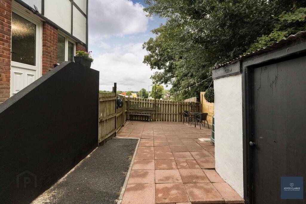 REAR GARDEN Private enclosed paved patio area. Block built shed with oil burner. Oil tank. Outside tap and lighting. Large gate giving access to driveway. Tarmac area providing secure parking. Spacious lawn area.