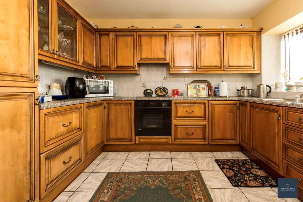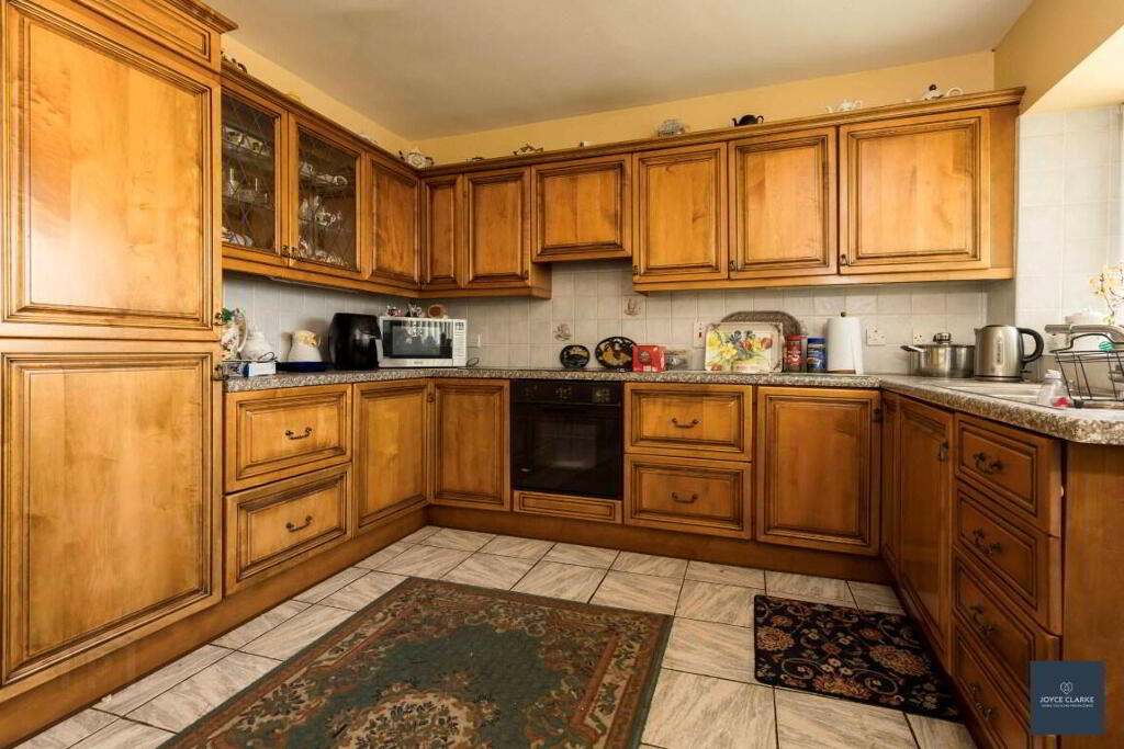 KITCHEN 4.60m x 4.87m (15' 1" x 16' 0") Dual aspect room. Full range of high and low level solid wood storage units and glazed display cabinet. Integrated oven and four ring ceramic hob with extractor over. Half bowl stainless steel sink and drainer with mixer tap. Fridge freezer. Tiled floor and splash back. Double panel radiator. Part glazed door to rear.