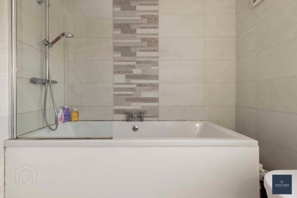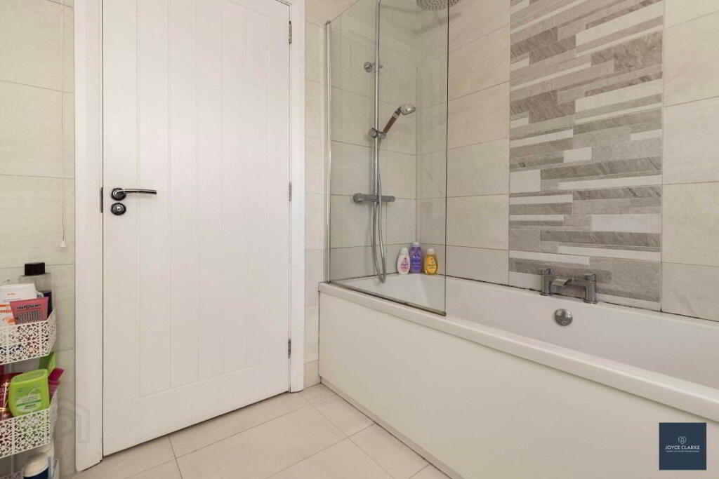 FAMILY BATHROOM 2.39m x 2.24m (7' 10" x 7' 4") Fully tiled family bathroom comprising of panel bath with centre taps, mains fed shower including additional rainfall showerhead and shower screen. Dual flush WC and wash hand basin with vanity unit below. Heated towel rail. Extractor fan.