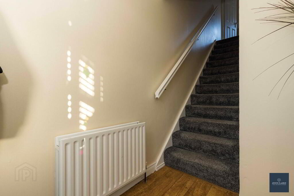 ENTRANCE HALL UPVC entrance door with glazed panel. Wood effect laminate flooring. Double panel radiator. Staircase leading to first floor.