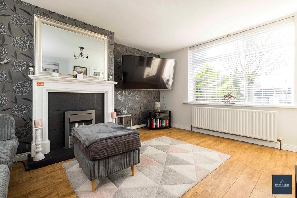 LIVING ROOM 3.77m x 4.35m (12' 4" x 14' 3") Front aspect reception room. Feature fireplace with wood surround, tiled back panel and hearth with electric insert. Wood effect laminate flooring. Double panel radiator.