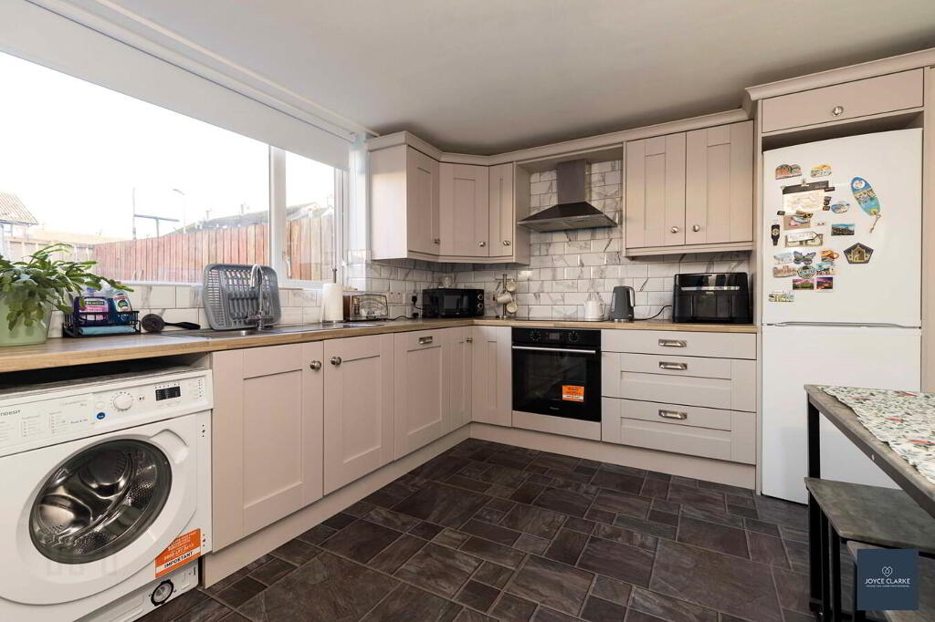 KITCHEN 5.27m x 3.10m (17' 3" x 10' 2") Excellent range of modern kitchen cabinets (recently fitted) including larder style unit and saucepan drawers. Tiled splashback. Range of appliances include electric oven, four ring electric hob with stainless steel extractor canopy above and integrated dishwasher. Space for fridge freezer and washing machine. Stainless steel sink and drainage unit. Tile effect laminate flooring. Double panel radiator. UPVC door with glazed panel giving access to rear of property.
