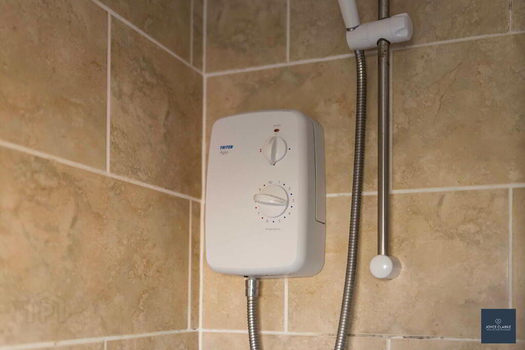 BATHROOM 1.96m x 1.7m (6' 5" x 5' 7") Three piece bathroom suite comprising of panel bath with electric shower and shower screen above, wash hand basin with pedestal and back to wall dual flush WC. Heated towel rail. Half tiled walls and additional wall tiling to walls around bath area.