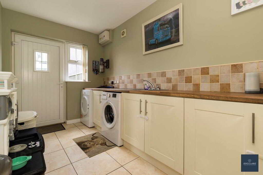 UTILITY ROOM 2.07m x 3.78m (6' 9" x 12' 5") Range of low level units with space for washing machine and tumble dryer. Tiled flooring and splashback. Stainless steel sink and drainage unit. Single panel radiator. uPVC door with glazed panel and glazed panel to side. Extractor fan.