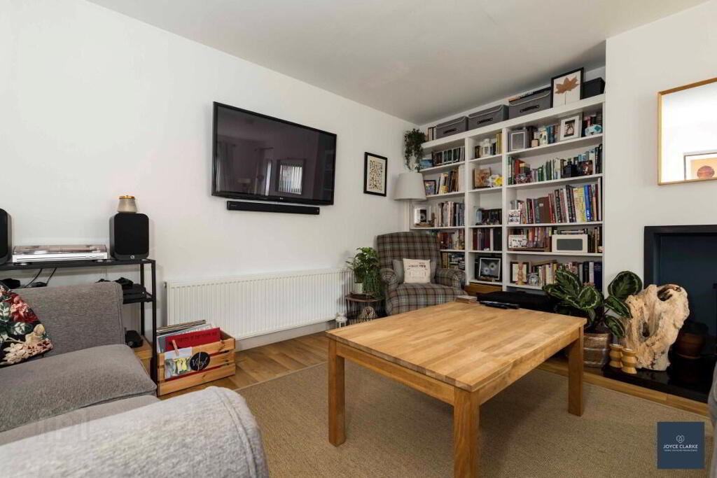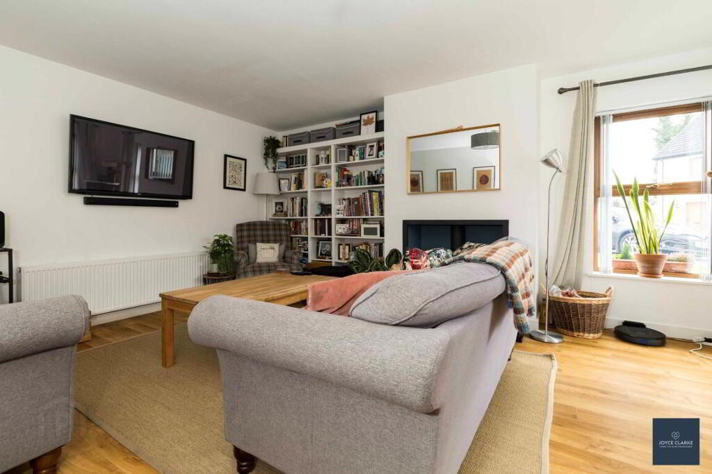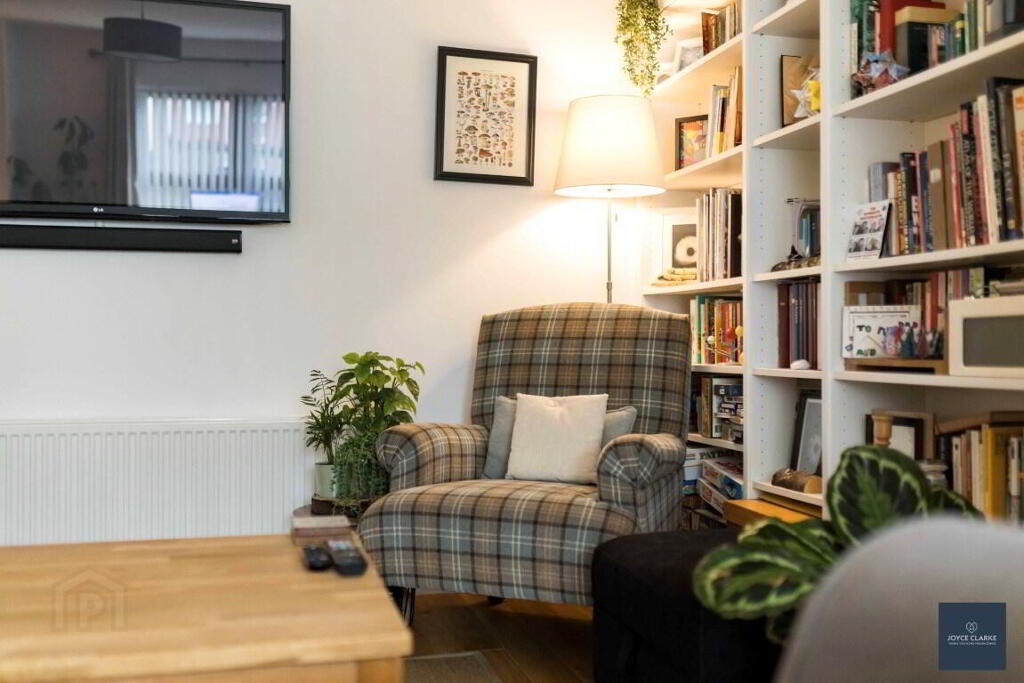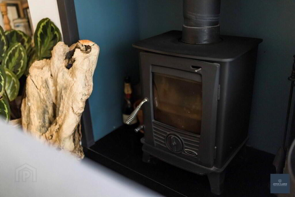 LIIVNG ROOM 4.19m x 5.61m (13' 9" x 18' 5") (MAX) Dual aspect reception room. Bespoke book case. Double panel radiator. TV point. Multi fuel stove set upon tiled hearth in recessed chamber. Laminate flooring.