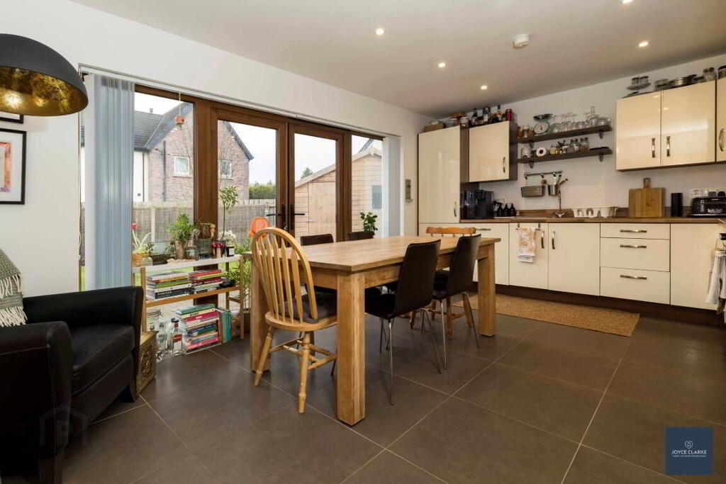 4 Nicholson Green is sure to impress, with tasteful décor throughout this spacious home and fantastic natural light throughout. Relax in the dual aspect living room with multi fuel stove and stunning bespoke book case. The open plan kitchen dinning has a super range of storage cupboards and integrated appliances with double patio doors bringing you to the garden. A utility room and downstairs WC complete the ground floor. As you head upstairs you are met with a large landing leading into four well proportioned bedrooms, the master with en suite. The family bathroom is modern with waterfall dual shower over the bath. This home will also impress on the outside, with a fully enclosed garden to the rear, laid in lawn with a paved patio ideal for entertaining. There is also a tarmac driveway to the side of the house with space for multiple vehicles parking. An added bonus is that school, shops and amenities are all within easy walking distance of this beautiful home. We recommend early viewing as this home will be snapped up!