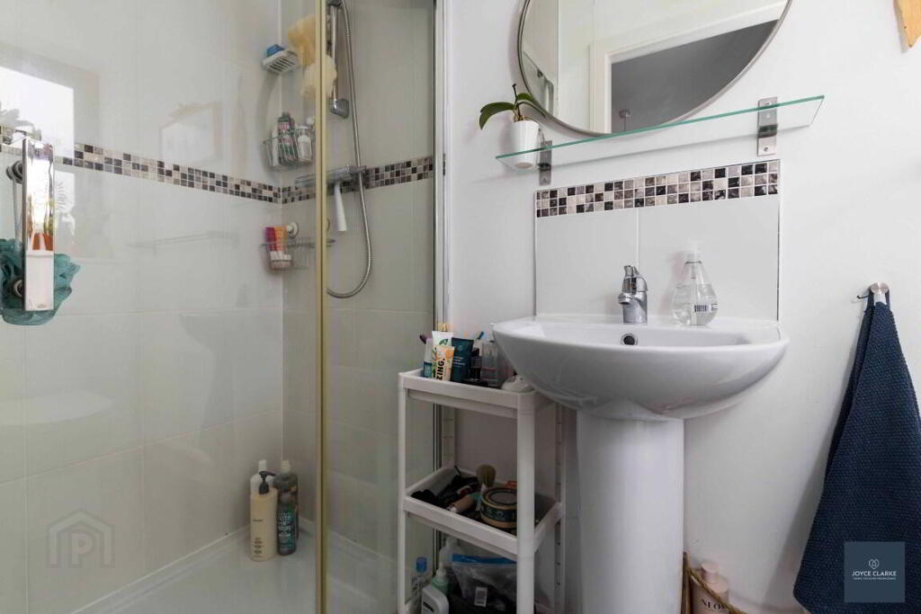 ENSUITE 1.01m x 2.50m (3' 4" x 8' 2") Shower enclosure with mains fed shower. WC. Pedestal style sink with mixer tap. Double panel radiator. Tiled floor, part tiled walls. Window. Extractor.