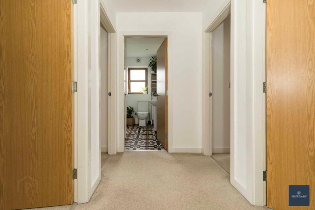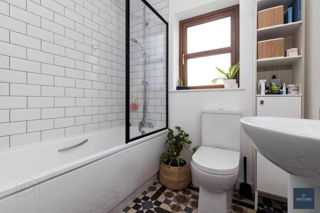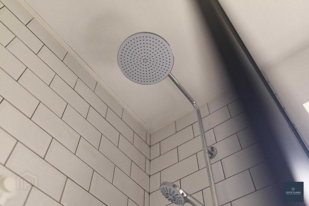 FAMILY BATHROOM 1.95m x 2.68m (6' 5" x 8' 10") (MAX) Modern three piece suite comprising of bath with waterfall dual shower over. Back to wall dual flush WC. Pedestal style sink with mixer tap. Double panel radiator. Tiled floor and part tiled walls. Recessed lighting. Window. Extractor. Hotpress.