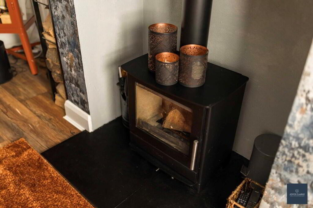 LIVING ROOM 3.30m x 4.57m (10' 10" x 15' 0") Feature multi fuel stove inset chamber with beam mantle, set upon tiled hearth. Feature wall panelling, laminate flooring. Double panel radiator. TV point.