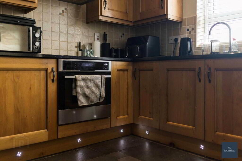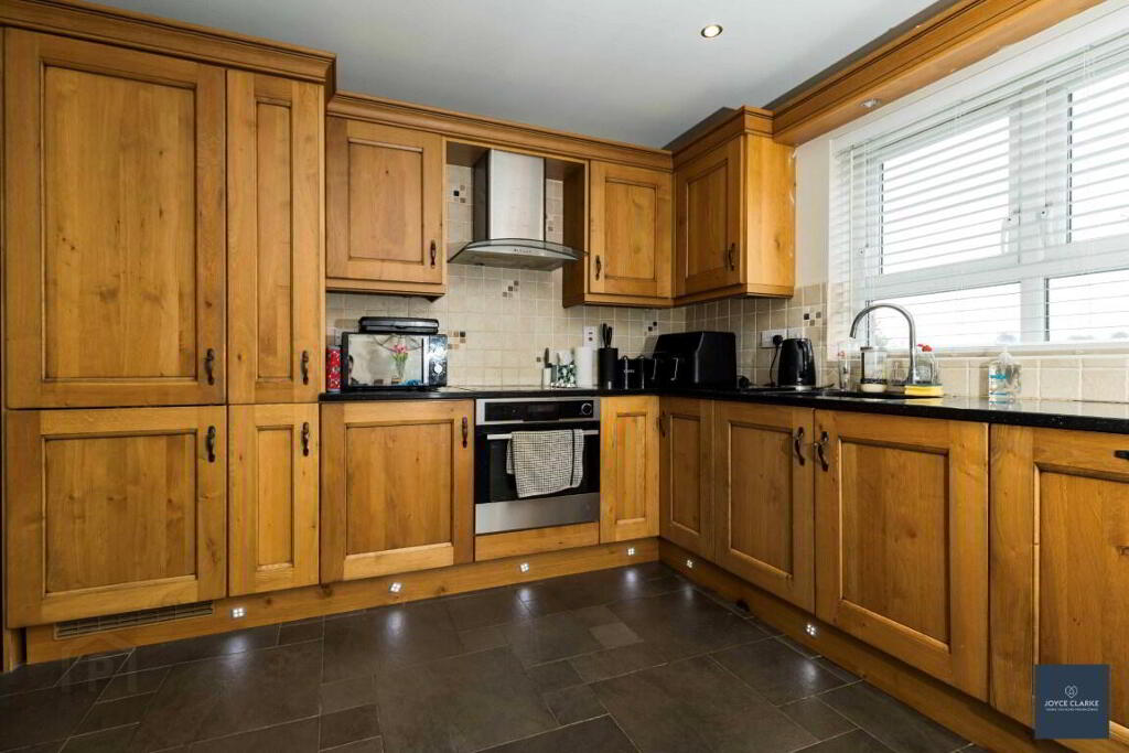 KITCHEN DINER 5.55m x 4.85m (18' 3" x 15' 11") (MAX) Excellent range of high and low kitchen cabinets including granite worktops, solid wood doors and larder style units. Range of appliances include electric oven, four ring electric hob with extractor fan with glass canopy above and integrated dishwasher. Underfitted one and half bowl stainless steel sink. Tiled flooring and splashback. Kickboard lighting. Double and single panel radiators. Recessed lighting to kitchen area.