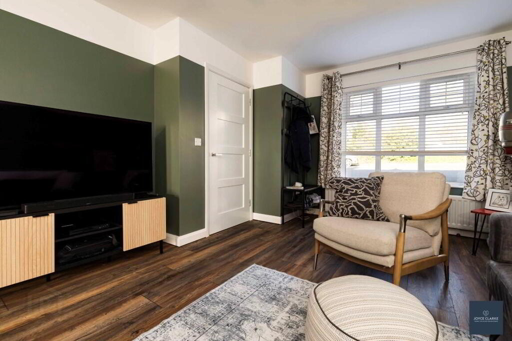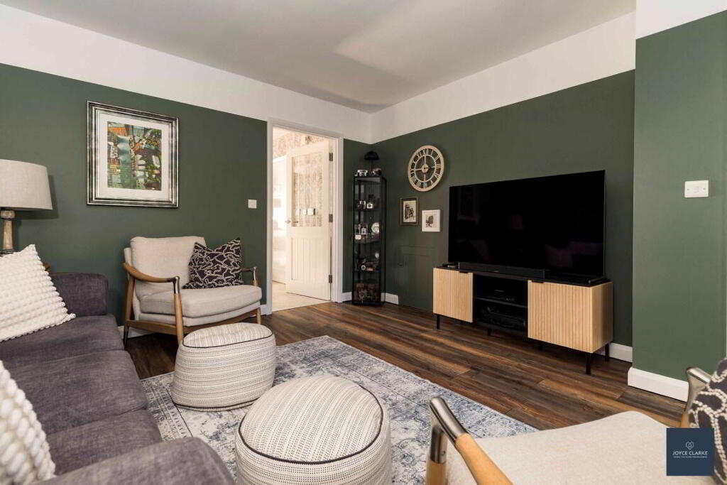 LIVING ROOM 3.67m x 5.10m (12' 0" x 16' 9") (MAX) Front aspect reception room. Feature wall panelling. Built-in storage cupboard. Wood effect laminate flooring. Telephone point. Door with glazed panel leading to kitchen dining living.