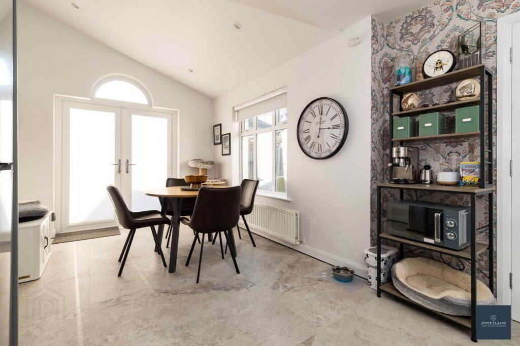 KITCHEN DINING LIVING 3.19m x 6.28m (10' 6" x 20' 7") (MAX) Range of high and low level refurbished kitchen cabinets including new doors, lazy Susan corner unit and Quartz worktop overlay and splashback. Range of appliances include new electric oven, four ring electric hob with stainless steel extractor canopy above and integrated dishwasher. Space for fridge freezer stainless steel one and half bowl sink and drainage unit. Tiled flooring. Two double panel radiator. Shed ceiling to living area with double patio doors leading to rear garden. Recessed lighting.