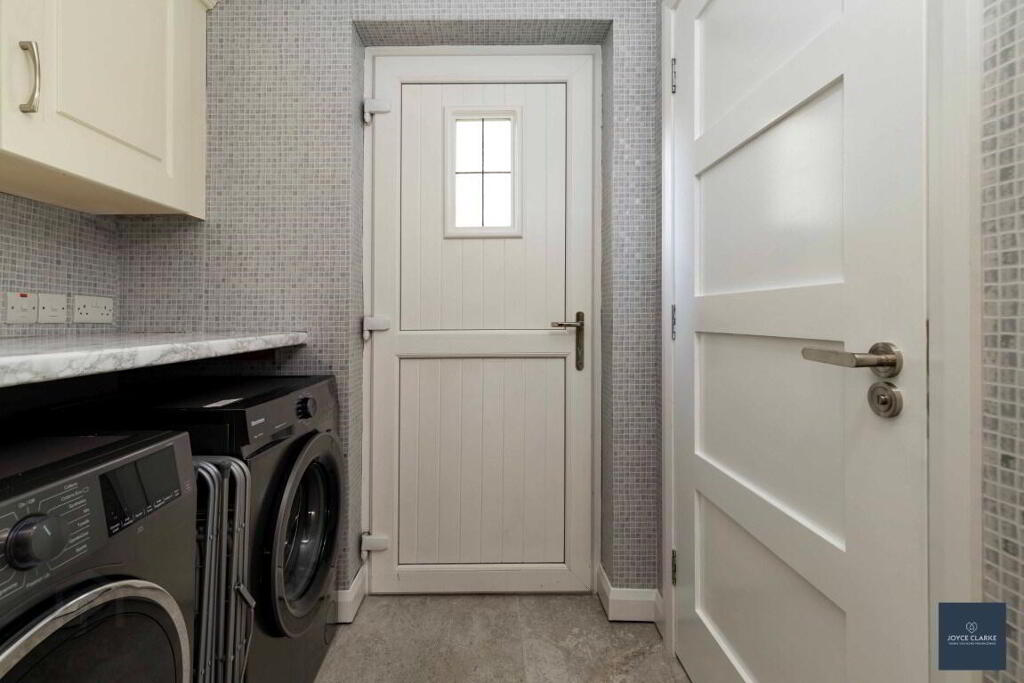 UTILITY ROOM 1.44m x 1.43m (4' 9" x 4' 8") High level kitchen cabinets. Worktop space. Space for washing machine and tumble dryer. Extractor fan. Tiled flooring. UPVC door with glazed panel giving access to side.