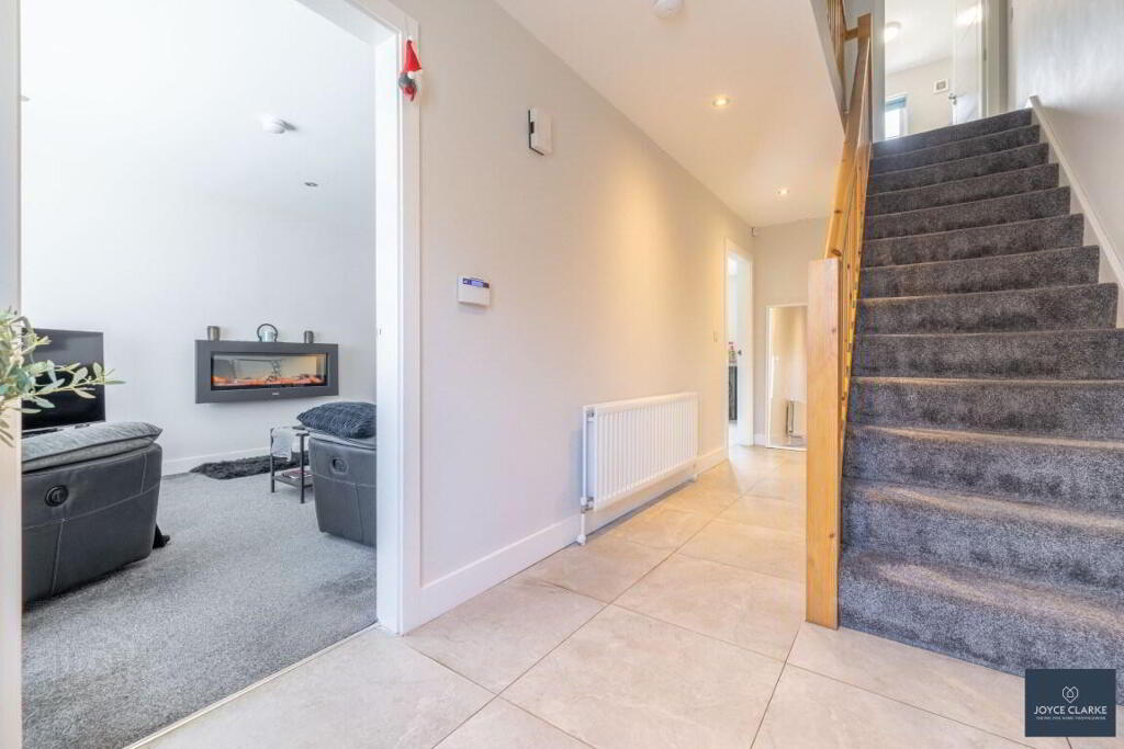 ENTRANCE HALL Composite entrance door with glazed panel. Tiled flooring. Storage cupboard under stairs. Alarm panel. Double panel radiator.