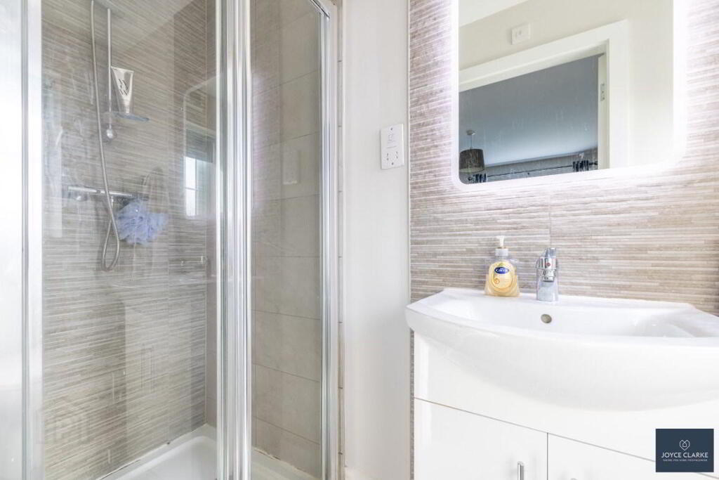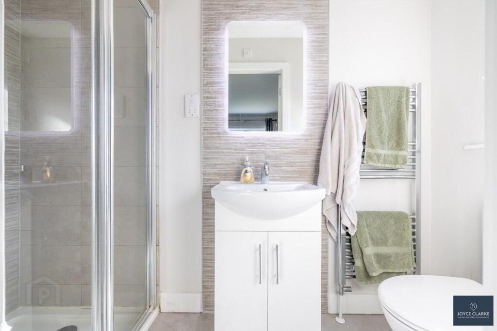 ENSUITE 2.64m x 1.04m (8' 8" x 3' 5") Tiled shower enclosure with mains fed shower. Dual flush WC and wash hand basin with vanity unit below. Heated towel rail. Tiled flooring and feature floor to ceiling splashback. Extractor fan. Window providing natural light.
