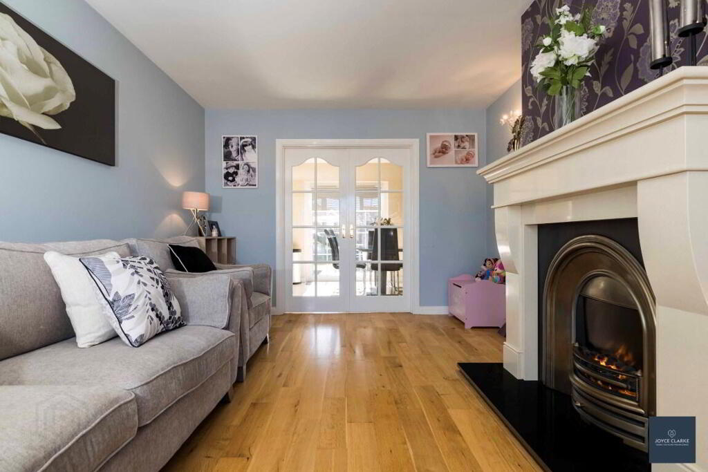 LIVING ROOM 5.24m x 3.28m (17' 2" x 10' 9") French aegean limestone fireplace with granite hearth and electric fire. Oak flooring. Bay window. French doors into kitchen / dining room. Double panel radiator. TV point.