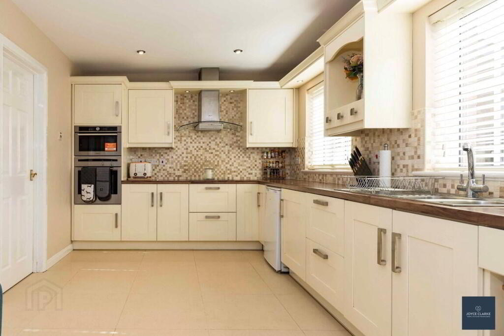 KITCHEN DINING 7.73m x 2.96m (25' 4" x 9' 9") Extensive range of high and low level units with integrated appliances to include fridge, dishwasher, microwave, built in NEFF eye line oven & hob with stainless steel and glass extractor, dishwasher Pelmet over sink and hob with down lighters. Butchers block effect work top. Tiled floor and splash back. Double patio doors to garden. Recessed lighting. Double panel radiator.