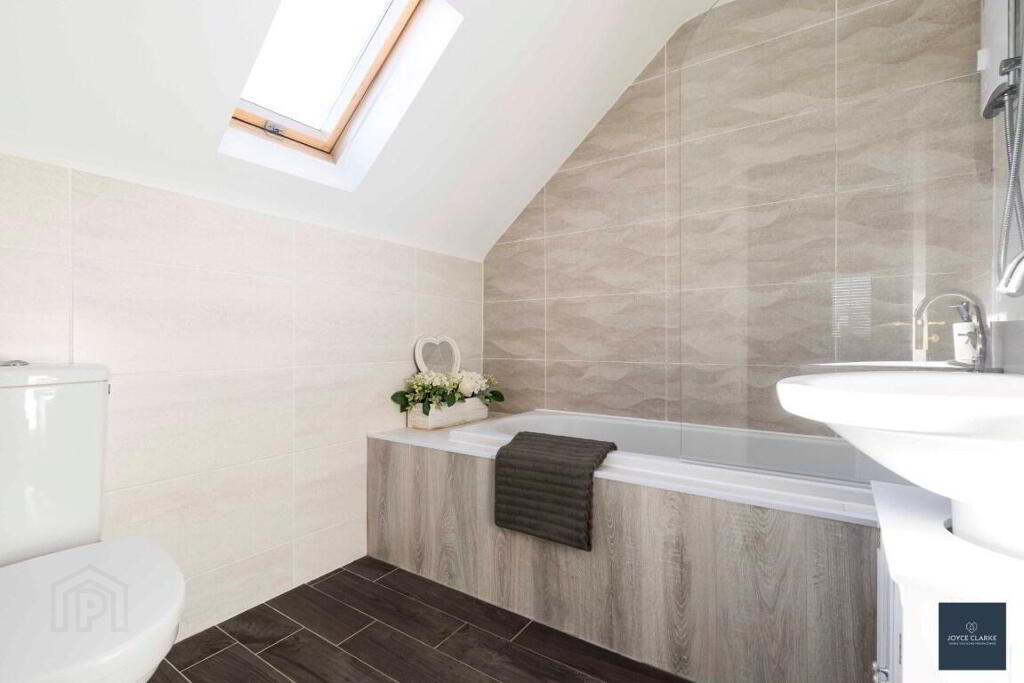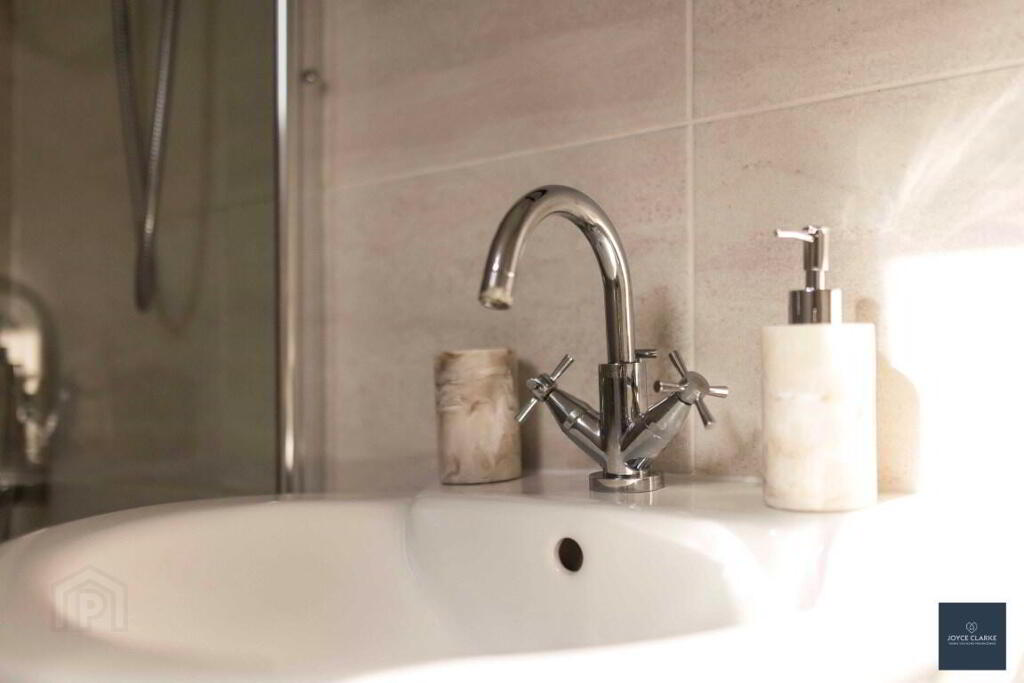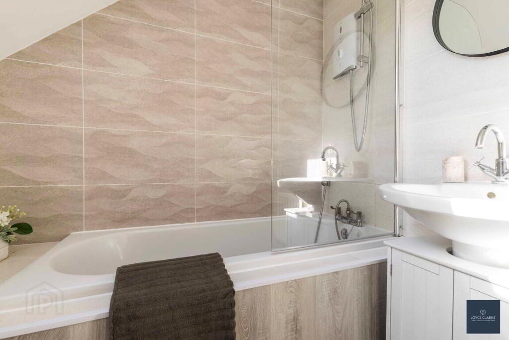BATHROOM Three piece suite comprising of dual flush WC, pedestal sink, bath with Mira Sport shower over. Tiled floor and part tiled walls. Recessed lighting. Extractor.