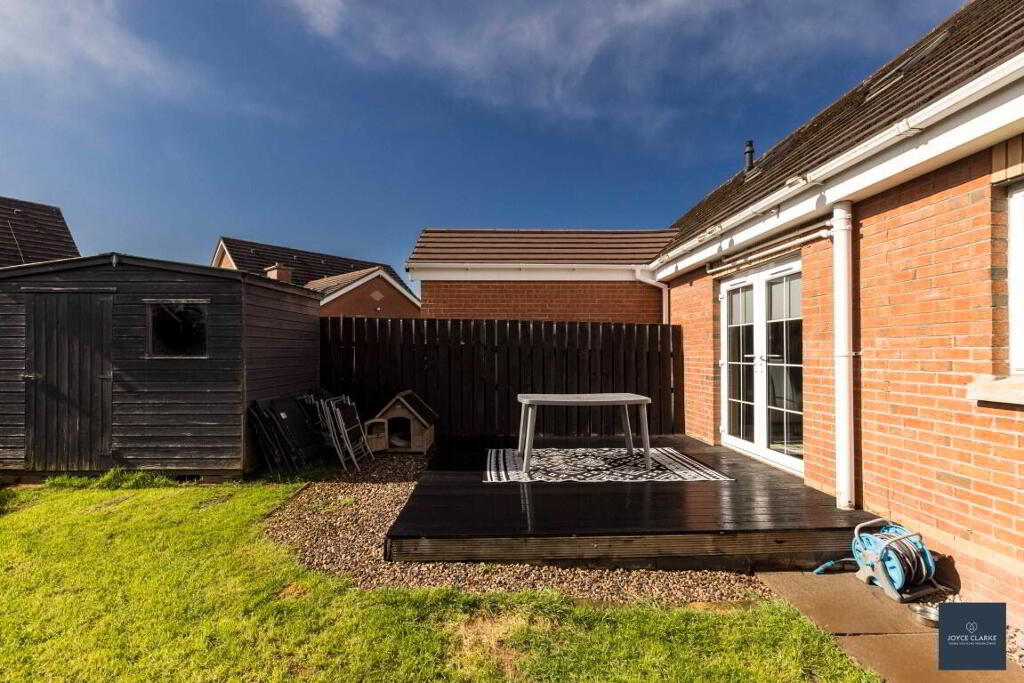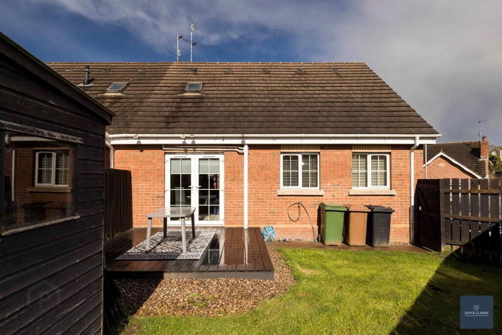 OUTSIDE Gardens laid in lawn to front and rear. Decking area ideal for entertaining. Garden shed. Outside tap. Gate to driveway.