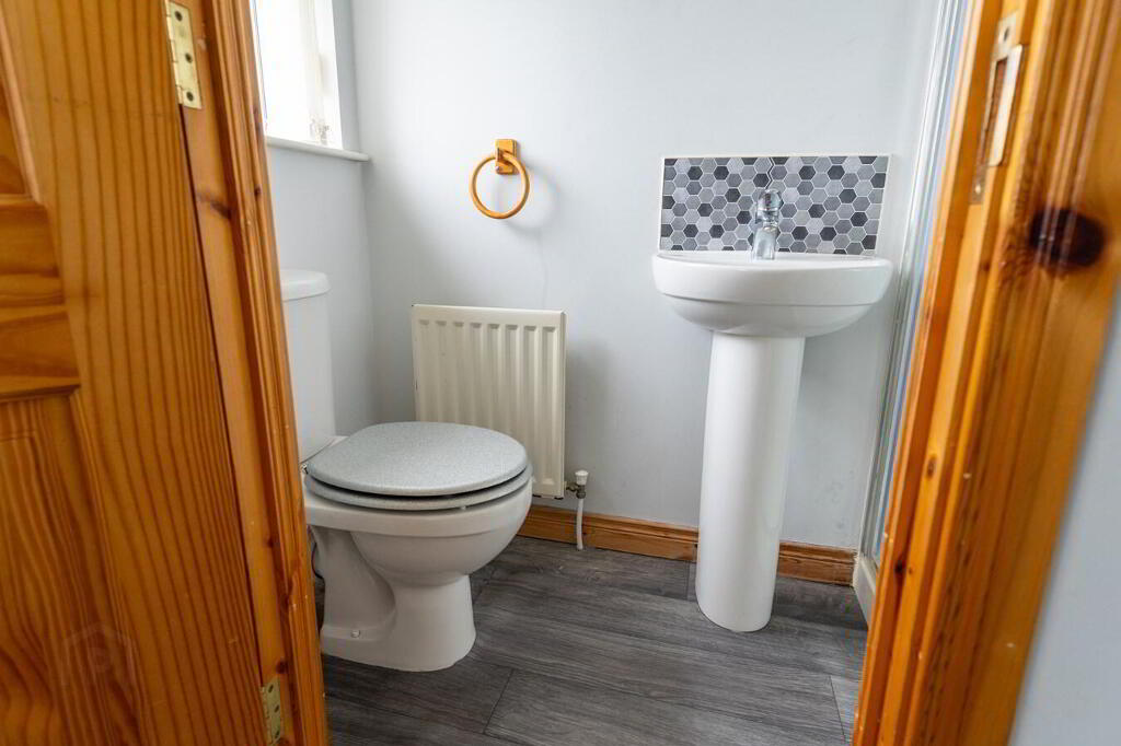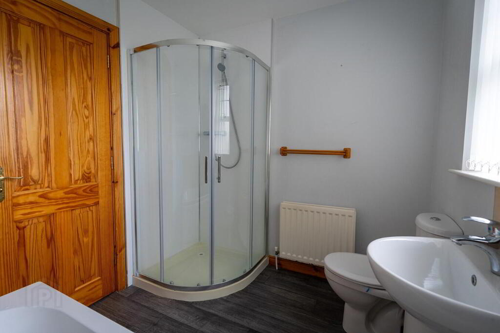 FAMILY BATHROOM 2.44m x 2.94m (8' 0" x 9' 8") Four piece suite comprising of moulded bath with mixer tap. Pedestal style sink with mixer tap and splash back. Corner shower enclosure with uPVC panelling. Back to wall dual flush WC. Double panel radiator. Window. Extractor.