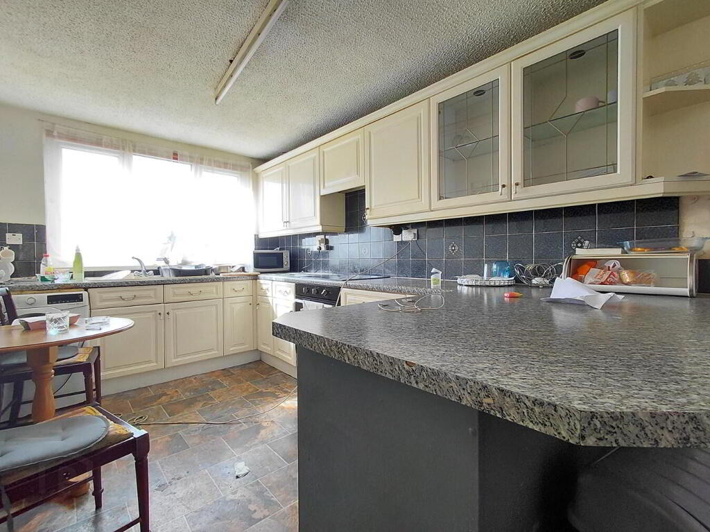 KITCHEN 2.54m x 4.38m (8' 4" x 14' 4") Range of high and low level kitchen cabinets with peninsula. Electric oven, four ring electric hob. Space for washing machine and fridge. Composite sink and drainage unit. Tiled effect vinyl flooring. Double panel radiator