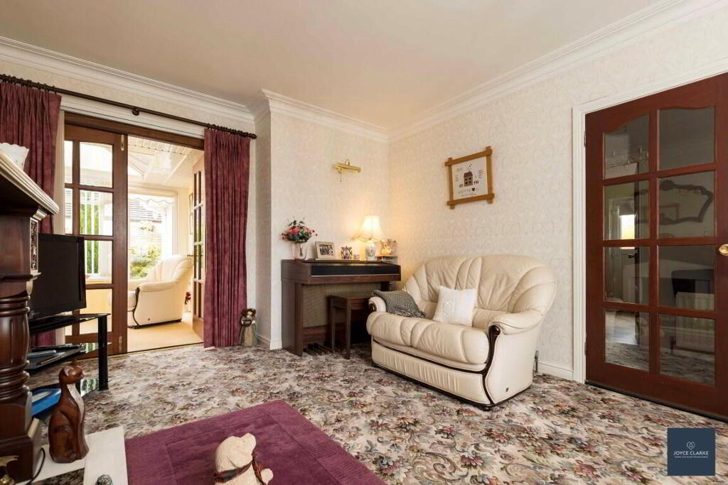 LIVING ROOM 3.70m x 4.81m (12' 2" x 15' 9") (MAX) Front aspect reception room with feature fireplace with mahogany surround, marble back panel and hearth, electric insert. TV point. Two double panel radiators. Double French doors with glazed panels leading to conservatory.