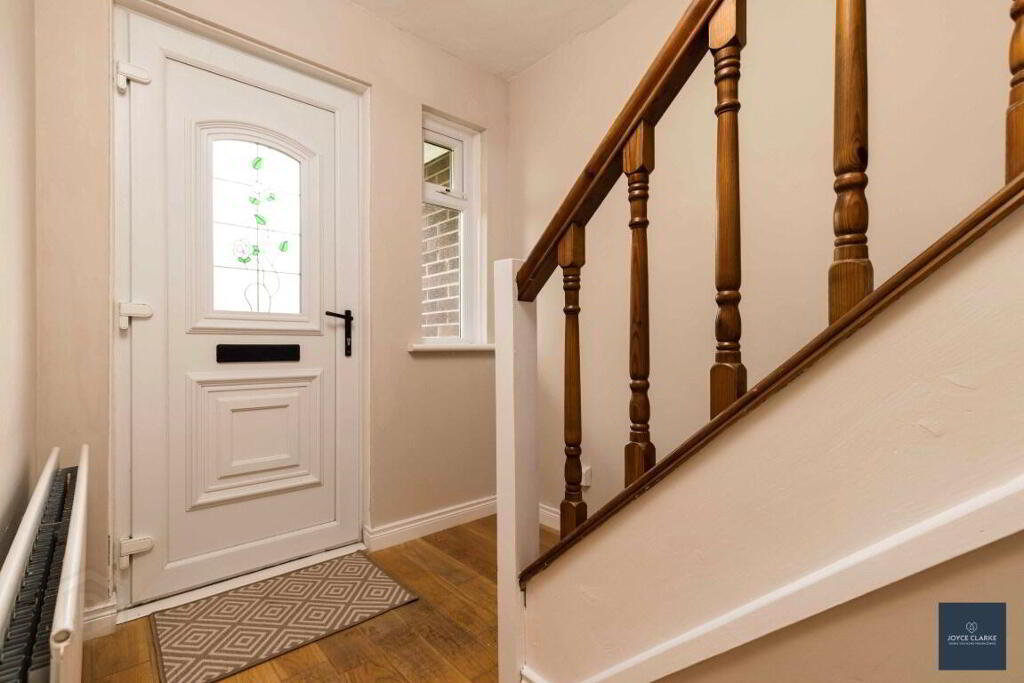 ENTRANCE DOOR uPVC entrance door with ornate centre glazed panel leading to hallway. Double panel radiator. Wooden flooring. Storage cupboard.