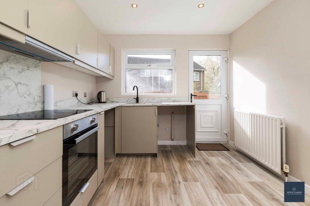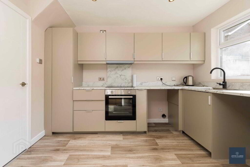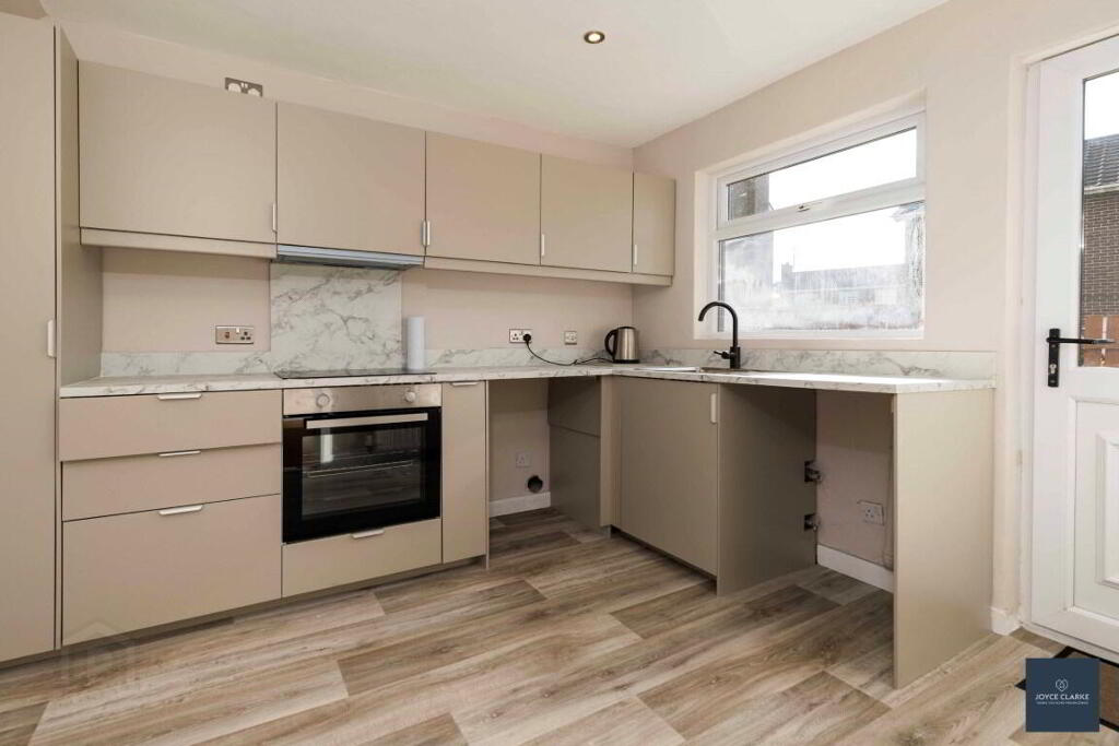 KITCHEN 2.89m x 3.28m (9' 6" x 10' 9") Brand new kitchen with range of high and low level storage units with soft close drawers. Integrated oven, four ring ceramic hob with extractor over. Stainless steel sink with drainer with mixer tap. Space for fridge and washing machine. Double panel radiator. Laminate flooring. Recessed lighting. Part glazed uPVC door to rear garden