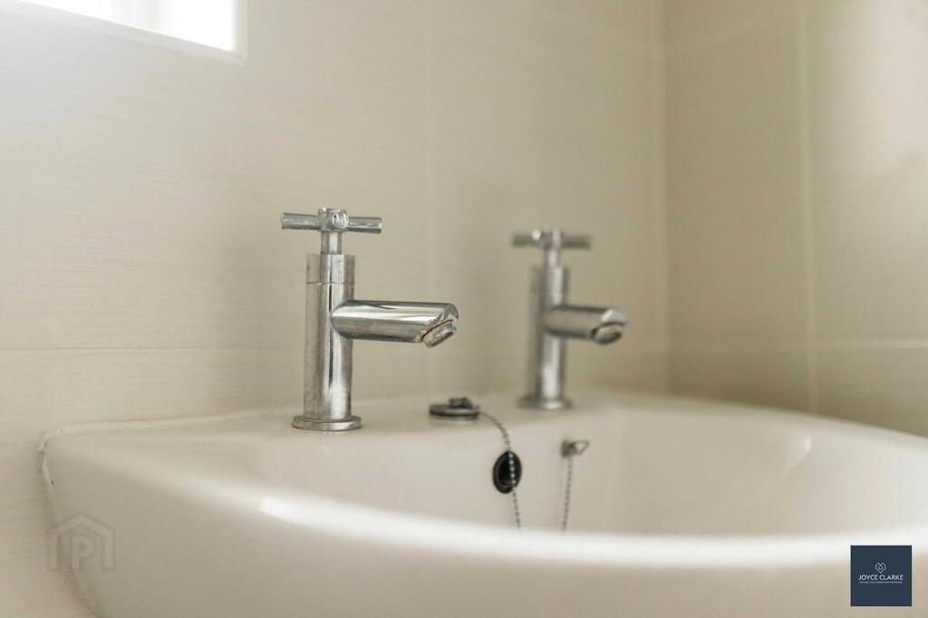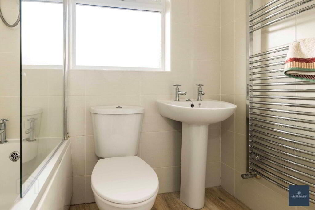 FAMILY BATHROOM 2.08m x 1.88m (6' 10" x 6' 2") Fully tiled bathroom comprising of three piece suite to include moulded bath with MIRA Play electric shower over. WC. Pedestal style sink. Heated towel rail. Hotpress.