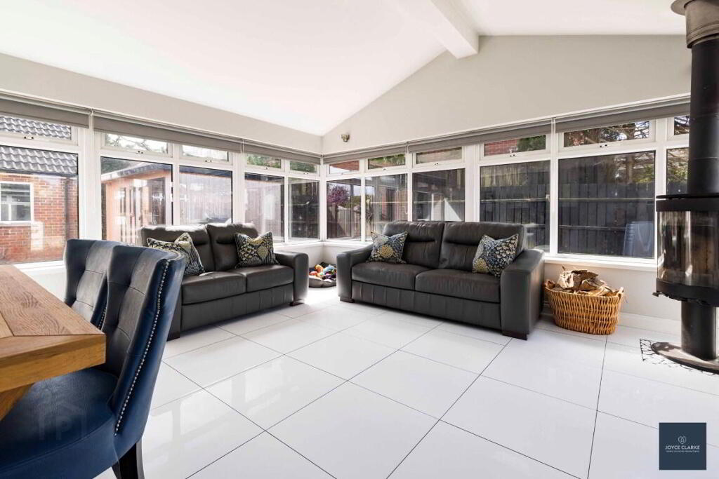 SUNROOM 4.58m x 4.79m (15' 0" x 15' 9") Corner raised wood burning stove with curved body. Tiled flooring. Ceiling mounted TV point on a rotational bracket. Double UPVC door giving access to rear garden.