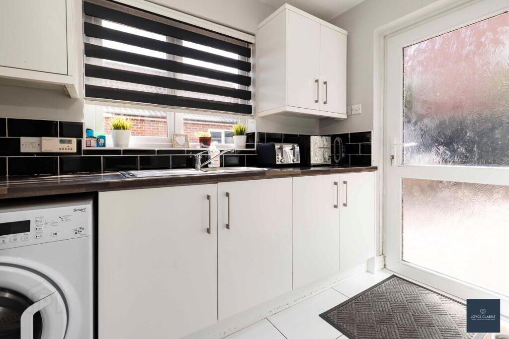 UTILITY ROOM 1.59m x 2.87m (5' 3" x 9' 5") Range of high and low cabinets. Tiled flooring. Stainless steel sink and drainer unit. Space for washing machine. Power points. Double panel radiator. UPVC rear door with frosted glazed panels giving access to rear. Heating control panel.