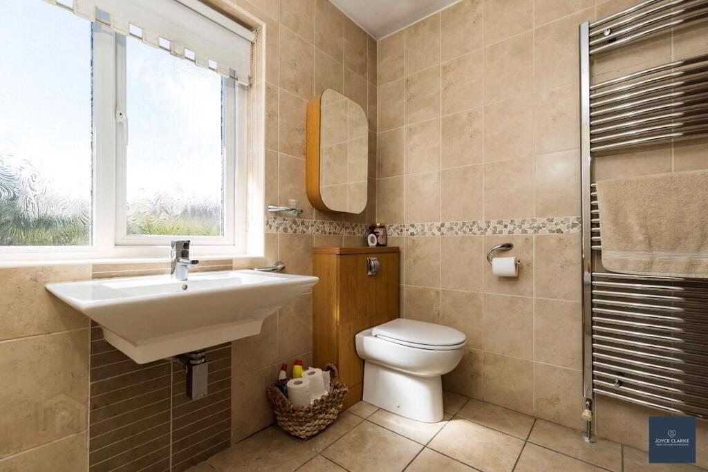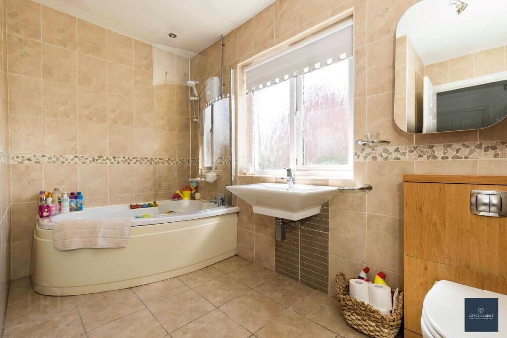 FAMILY BATHROOM 2.99m x 1.55m (9' 10" x 5' 1") Fully tiled family bathroom. Three piece suite consisting of corner bath with Triton electric shower above. Dual flush WC. Floating wash hand basin. Heated towel rail.