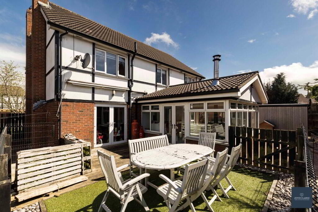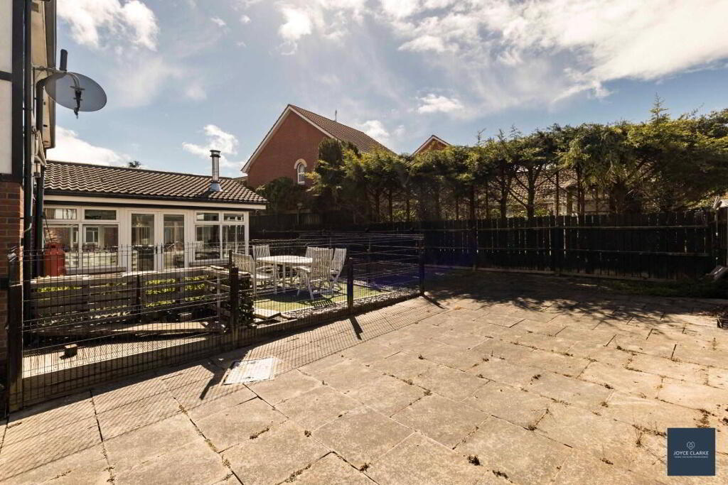 REAR GARDEN Fully enclosed spacious rear garden . Raised flower beds with mature shrubs. Oil tank. Outside tap. Paved patio area with roller awning above. Double timber gate. Pedestrian gate with access to side. Paved driveway.